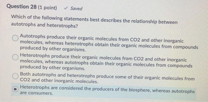 Carbon dioxide carbon oxygen water 3. An autotroph is a producer. 20 Which of the following is an autotrophic.